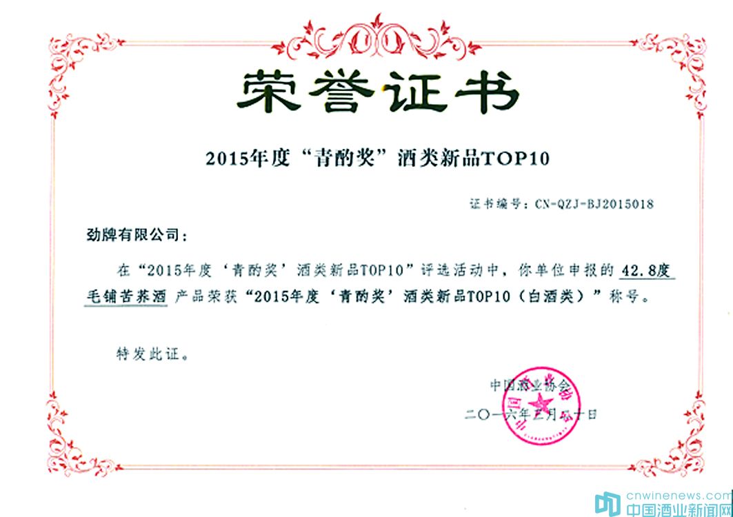 3月20日,2015年度“青酌奖”酒类新品TOP10发布盛典在四川省泸州市巨洋会议中心盛大举行。在坚持公正、公平、公开的原则下,经过专家的专业评审,以及消费者、媒体及经销商代表的大众评选,劲牌有限公司申报的42.8度毛铺苦荞酒产品荣获“2015年度‘青酌奖’酒类新品TOP10(白酒类)”称号。