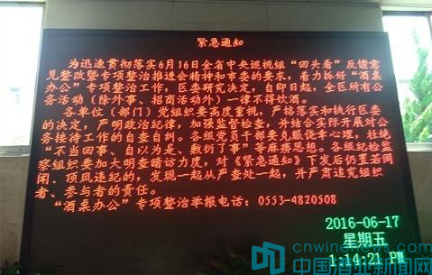 此外,安徽淮南寿县县委办公室也在6月17日发布通知称,为认真贯彻中央巡视组巡视“回头看”反馈意见整改暨专项整治推进电视电话会会议精神,根据市委统一部署,按照有关规定,在全市范围内开展“酒桌办公”专项整治工作。