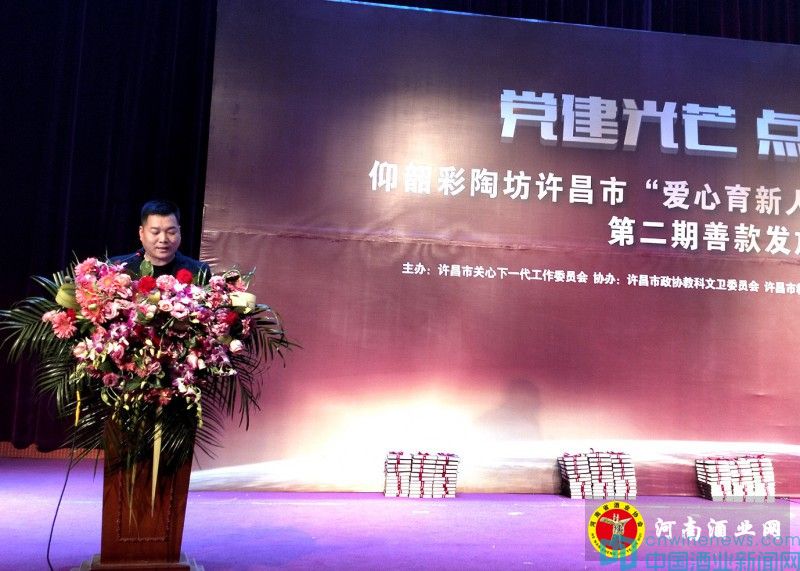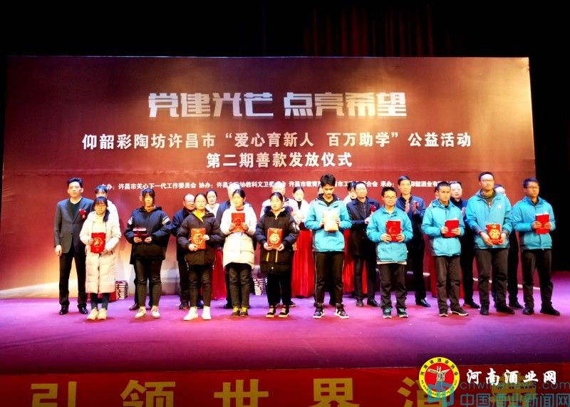 12月13日,继郑州、焦作、新乡、三门峡等地开展百万公益助学活动之后,仰韶彩陶坊百万助学公益活动第二季助学金发放仪式在许昌电气职业技术学院温情举行,许昌市关工委常务副主任、政协原副主席袁根波,河南省酒业协会会长熊玉亮,仰韶营销公司总经理郝惠锋等领导嘉宾、社会各界爱心人士共同见证此次公益盛典。