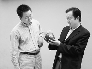 图为青海省喜玛拉雅青稞酒有限公司董事长肖海青(右一)正在向青海省酒类行业协会常务副秘书长邬健介绍样品酒。