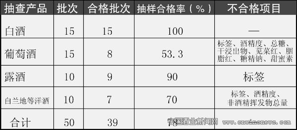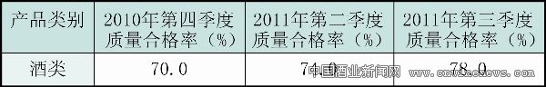 “仿洋”现象较严重 2011年三季度,广东省工商局委托广东省酒类检测中心对该省流通环节酒类市场进行监督抽查。从抽检结果看,阳江市的抽检产品情况较满意,抽检15个批次,只有2个批次的产品不合格,其次是中山市,抽检10批次产品有2批次不合格;较差的是珠海市,产品合格率只有70%。酒的质量方面:本次抽检白酒合格率达到100%;露酒90%;白兰地(国产)质量有待提升;葡萄酒的质量较差,合格率只有53.3%。