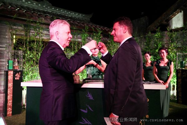 《时代》周刊、《财富》杂志全球发行总监Andy Bush(右)与友人品鉴“水井坊 菁翠”