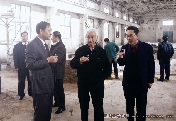 著名酿酒专家季克良(中)在云门酒业酱香车间指导工作。 转载此文章请注明文章来源《华夏酒报》。