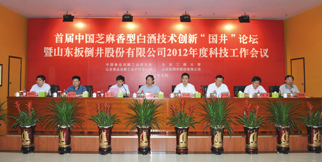此次论坛,是 “中国芝麻香白酒研究院”创立后召开的第一次科技工作会议。2011年7月,首家中国芝麻香白酒研究院成立,由山东扳倒井集团与中国食品发酵工业研究院、山东省食品发酵工业研究设计院三方联合共建,同时还签署战略合作协议,共建中国芝麻香白酒研究基地、中国芝麻香白酒微生物联合实验室,加强白酒领域国家科技项目的攻关,并参与承担“十二五”大型国家科研攻关项目。9月,中国食品行业唯一的中国工程院院士孙宝国正式加盟扳倒井研发,芝麻香白酒研究上升为国家科技发展战略。四方单位合作,旨在加强芝麻香型白酒技术创新产、学、研协作,集成产业与科技资源,就芝麻香型白酒微生物种群典型特征、功能性微生物代谢产物与标志性成份进行研究分析,促进生产工艺技术的改造和进步,打造中国芝麻香型白酒高端品牌,引领中国白酒产业的创新发展。经过近一年的工作,中国芝麻香白酒研究院在芝麻香型白酒典型和标志性风味物质分析、芝麻香型白酒原酒成香物质分析、酿造微生物与风味物质生成机制和代谢关系的研究、特征风味物质与酒体稳定性的研究等方面取得了大量创新成果。