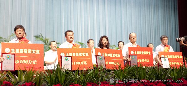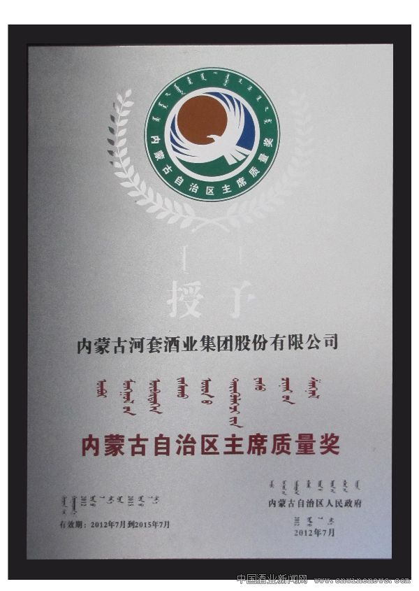 (右二):内蒙古河套酒业集团总经理王永强领取自治区“主席质量奖”