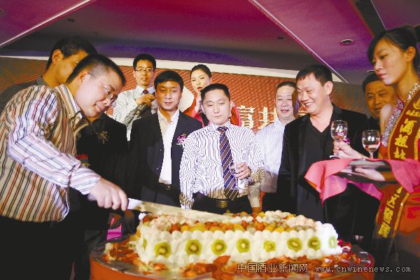 今年春季成都糖酒会上,洛阳杜康控股总经理吴书青(中)、销售公司总经理苗国军(左一)与经销商共同分享杜康财富蛋糕。