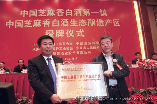 近日,由中国轻工业联合会和中国酒业文章来源华夏酒报协会联合主办的“中国芝麻香白酒第一镇暨中国芝麻香白酒生态酿造产区”授牌仪式在山东潍坊富华酒店举行,会上授予潍坊安丘市景芝镇为“中国芝麻香白酒第一镇”,山东景芝酒业股份有限公司为“中国芝麻香白酒生态酿造产区”。