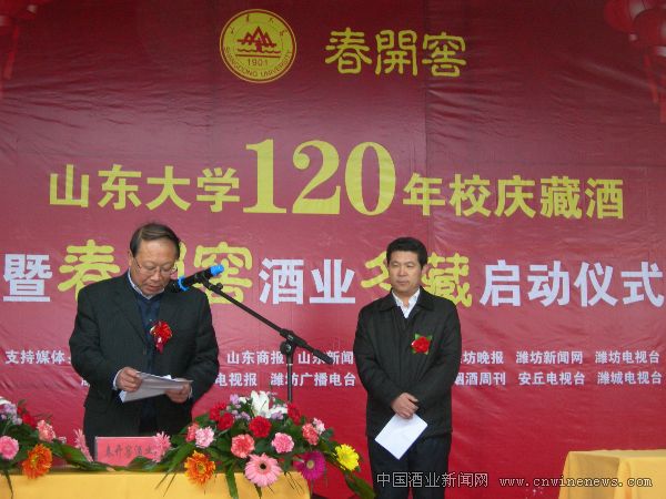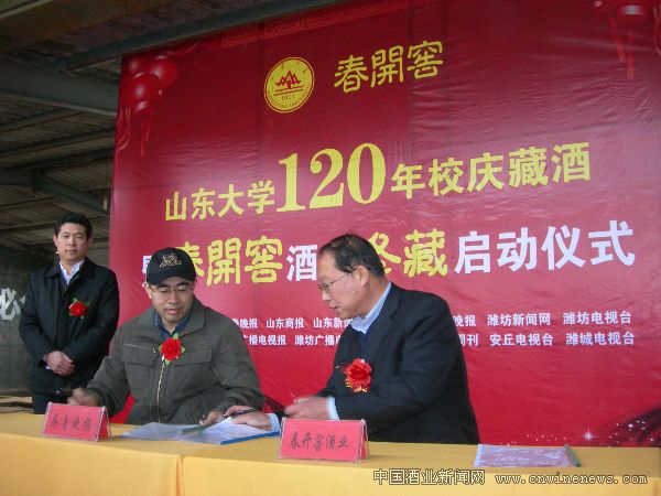 本次藏酒仪式由安丘市春开窖酒业公司和山东大学共同举办,2012年是山东大学成立120周年,为迎接这一时刻,山东大学和景芝春开窖酒业公司达成藏酒合作协议,在春开窖酒业公司藏酒作为九年以后的120周年校庆用酒。