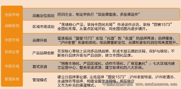 泸州老窖通过全国市场系统运营,建立起品牌升级系统、产品品牌创新系统、复式渠道系统,将弊端一一祛除。
