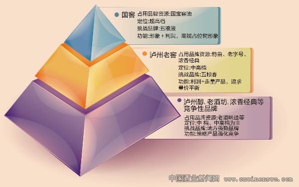 泸州老窖借助两个核心品牌在市场上相互促进,在引爆市场之后,以“泸州”两个字眼打头的“泸州老酒坊、泸州醇、泸州浓香经典”等为代表的其他系列品牌相机跟进,将品牌界定为三个板块:一是泸州老窖系列主流酒品;二是国窖系列贵族酒品;三是独有品牌系列。同时,泸州老窖对三个板块都进行了明确的品牌定位,严格规范各品牌产品线的延伸范围,最终形成了“完美的金字塔式品牌”结构。