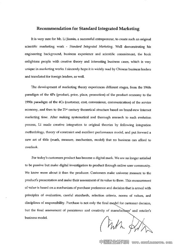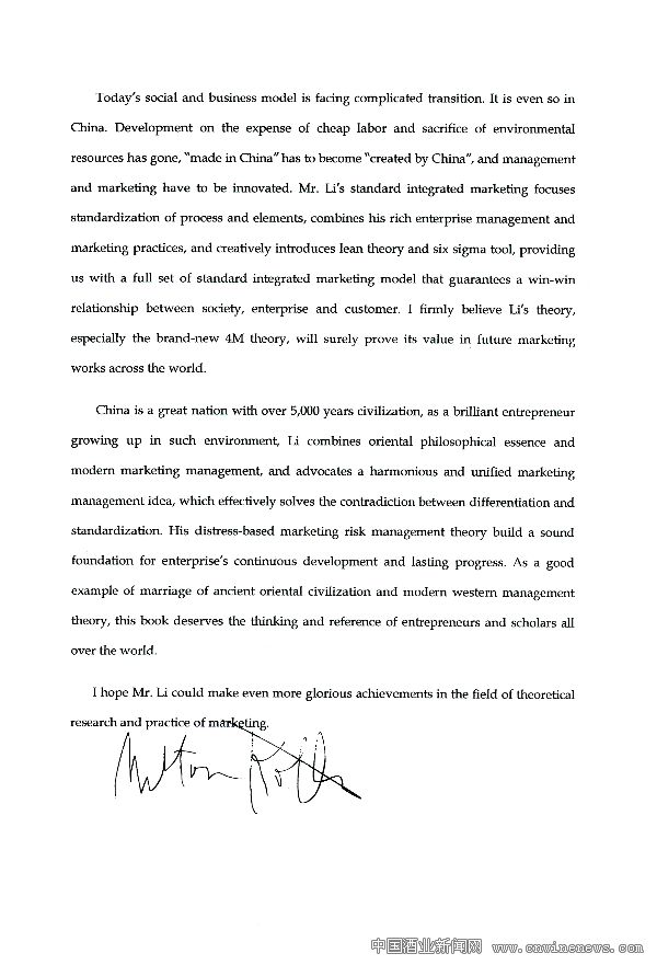 正如科大师所言,李家民先生专心致力于撰写《标准化整合营销》这本具有原创性的市场营销科学专著,这是非常难能可贵的。本书尽显李家民先生的工程师背景、商业实践以及科学奉献精神。他希望本书能够被中国的商界领袖们广泛阅读,同时也衷心希望把它尽早翻译给外国的商界精英们。