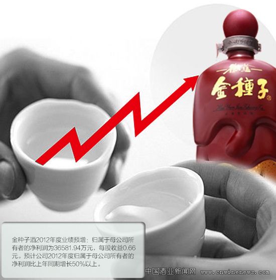2013年1月8日,金种子酒披露2012年度业绩预增,归属于母公司所有者的净利润为36581.94万元,每股收益0.66元。预计公司2012年度归属于母公司所有者的净利润比上年同期增长50%以上。