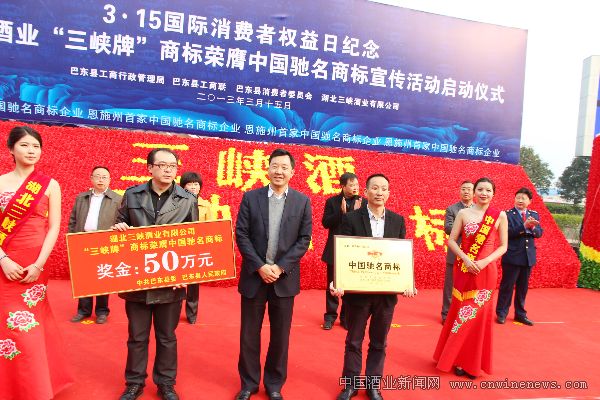 经国家工商总局批准,湖北三峡酒业有限公司“三峡牌及图”商标被认定为中国驰名商标。日前,湖北三峡酒业举办了“3·15”国际消费者权益日纪念暨湖北三峡酒业“三峡牌”荣膺中国驰名商标宣传活动启动仪式,湖北省巴东县领导现场奖励三峡酒业50万元。