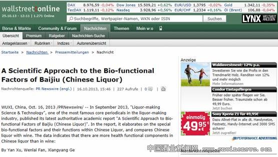 华尔街在线“中国传统白酒比葡萄酒更健康”观点文章(报道截图)