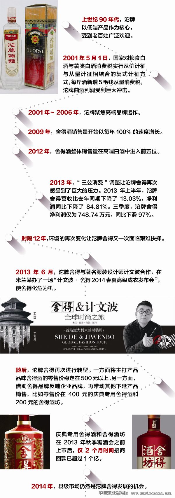 2013年是沱牌全力打造舍得品牌的第八个年头,加上此前的摸索期,沱牌用了12年时间实现了企业形象从低到高的转型。正当舍得酒逐渐在高端白酒阵营站住脚跟时,2013年,一场被视作“史无前例”的政策限制给高端白酒消费带来严重冲击。是继续走高,还是再度转型,沱牌舍得又一次面临进退抉择。