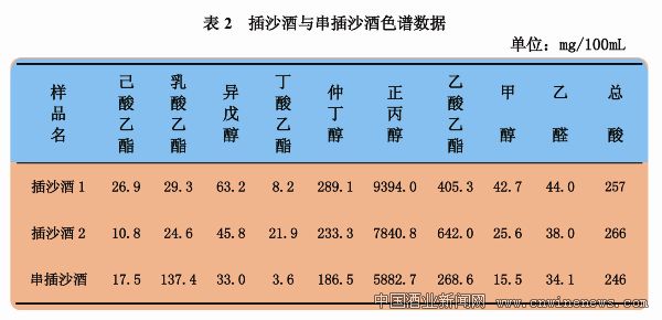 目前大型企业,把这部分插沙酒当做废酒处理,直接输送到污水处理厂处理。一部分中小企业是把这部分插沙酒存放起来,到这一生产周期快结束的时候,最后一次取酒时放入底锅中串出。串出的插沙酒各种杂味依旧很重,利用价值很低。插沙酒与串插沙酒色谱数据如表2。