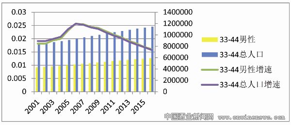 在黄付生看来,白酒行业的长期增长主要取决于人口结构和消费观念的转变,这种转变将影响白酒消费群体的基数和人均消费量。但就目前情况来看,人口结构和消费观念的转变对白酒行业消费量的影响较小,但长期各种因素的叠加必然会对消费量产生一定影响。白酒作为一种嗜好性消费,跟中年人群的消费占比有着密切的关系。根据《IMI消费行为与生活形态报告》,在我国白酒的重度消费群体中,主流消费群体的年龄分布为25岁~54岁,其中35岁~44岁的人群占比最高,达到30.7%,是白酒消费的主要人群。我国主要消费群体的增长速度在2006年达到最高,随后呈逐年下降趋势,因此,其对消费量的带动作用也是逐年下降的。