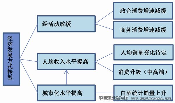 经济发展方式的转型对白酒消费量也呈负面影响。以2008年美国次贷危机为转折点,我国经济发展到了转型时期,主要体现为两个方面:第一,经济增速减慢,以投资拉动的经济增长很难持续;第二,收入分配体制改革,致使人均收入水平提高。这两方面对白酒行业的影响是不一样的,但总体影响要综合起来看。