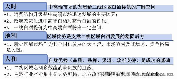 天时:行业正迎来中高端白酒发展的黄金时期;地利:区域市场具有一定优势,有稳固的后方,行政壁垒较强,有利于区域市场整合;人和:具有一定的品牌价值,地方政府为了发展当地经济,支持白酒企业的发展,为区域白酒发展提供了强大的动力。