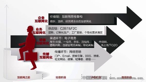 按照业界观察者的说法,无论是诸多酒企与第三方电子平台的合作,还是自建APP方式来做电子商务,或者类似于茅台直接成立直属电子商务公司,实际上,这都是企业内部互联网部门的升级版——它已经由最初的官网宣传功能,蜕变进化成具备销售力与生产力的新部门。