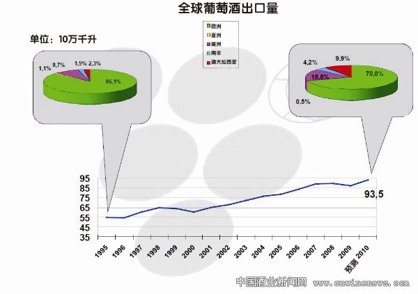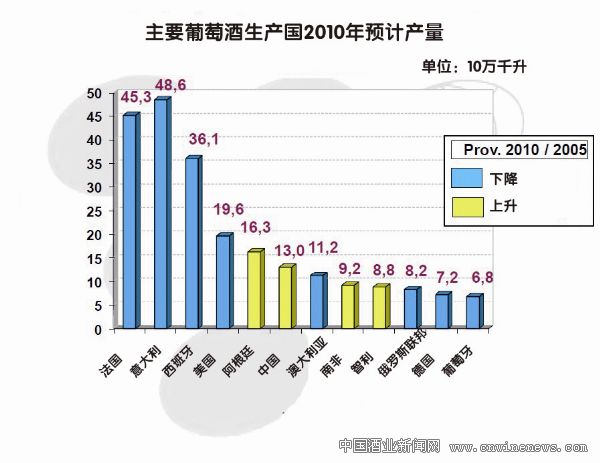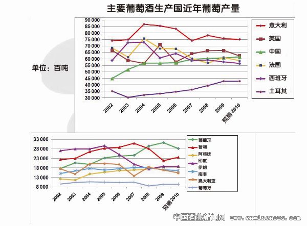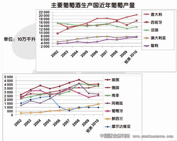 2010年,全球葡萄酒产量打破了近年来的上升态势,较2009年下降了74万千升,降幅约为2.7%,而2009年较2008年增长了11万千升。