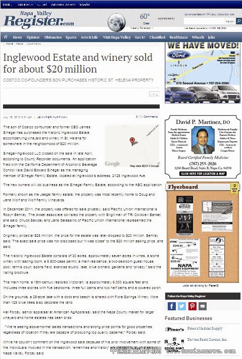 美国零售巨头COSTCO创始人之一、前任CEO James Sinegal之子,以大约2000万美元收购了位于加州圣海伦娜的历史名庄Inglewood Estate。
