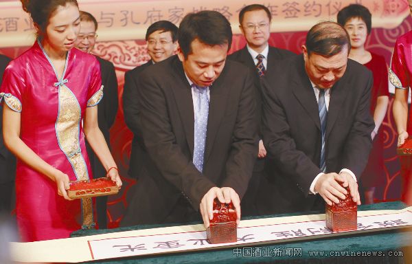 联想控股酒业公司总经理路通与孔府家酒业有限公司董事长邱振新在别具特色的卷轴上签署合约。联想酒业与曲阜市人民政府、孔府家酒业举行联合发布会,宣布联想酒业斥资4亿元收购孔府家酒业。