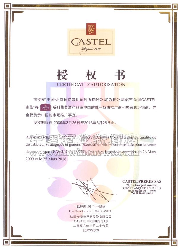 近日,法国卡斯特兄弟股份有限公司对外发出通知,该公司在法国当地原产的“CASTEL家族”牌系列葡萄酒产品,在中国市场由北京恒亿盛世葡萄酒有限公司独家授权代理,同时取缔原合作伙伴——北京东海鑫业国际酒业有限公司所有的相关权益。