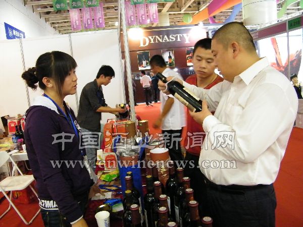 酒节上,烟台阳酒酒业有限公司推出的果酒新品桑葚酒受到了众多客商的青睐,图为公司业务员向客商介绍产品。