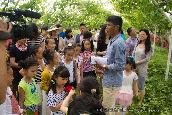 9:20分,所有小选手和家长在张裕牟子园葡萄基地的技术员张鹏和酒城公主导游的带领下由味美思大道出发,一边游园,一边为孩子们上起了科普知识课。在与孩子的热烈互动的氛围中,张技术员理论实践相结合,用生动形象的话语讲解了葡萄树栽培管理、鲜食与酿酒葡萄果实性状等一系列科普知识,解答孩子们提出各种充满童真的问题。头戴刚刚修剪下的小小葡萄穗的孩子们和小伙伴们一起在酒庄葡萄园观赏区内追逐着,寻找着蒲公英,玩的不亦乐乎。小选手刘智雨的爸爸表示,今天孩子参加科普培训,是一次真正意义上的体验和感受,不仅让孩子在假期放松了身心,近距离的接触大自然,更重要的是学习了解到了葡萄生长过程等农林科普知识。