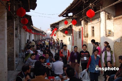2月5日下午,农历正月十一,广西南宁宾阳县在老街举行“百家宴”灯酒会,沿街摆满酒宴,万众云集,庆祝当晚举行的最盛大的传统节日“炮龙节”。灯酒本为“丁酒”,原为一年来有喜得贵子(民间也叫“添丁”)的人家为表示庆贺,献出阉鸡等好菜好酒宴请邻居街坊共同庆祝,同时希望各家各户也人丁兴旺,来年喜得贵子事业兴旺发达。现如今,吃灯酒已演变为人们共同出资,联络感情,规划美好未来的喜庆会。