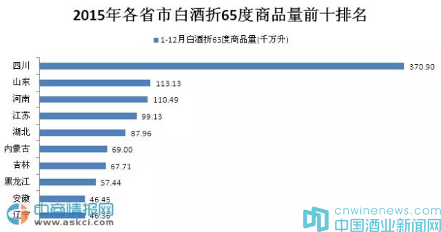 另外,2015年白酒折65度商品量前十的省市分别是四川、山东、河南、江苏、湖北、内蒙古、吉林、黑龙江、安徽以及辽宁。各省市产量依次是370.90千万升、113.13千万升、110.49千万升、99.13千万升、87.96千万升、69.00千万升、67.71千万升、57.44千万升、46.45千万升和46.36千万升。