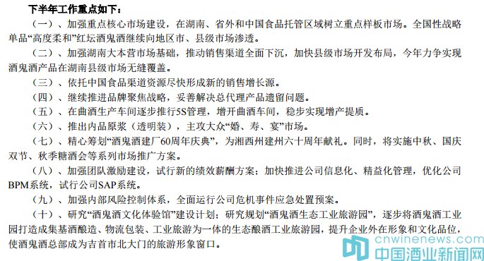 同时,酒鬼酒半年报披露其下半年工作重点,具体如下: