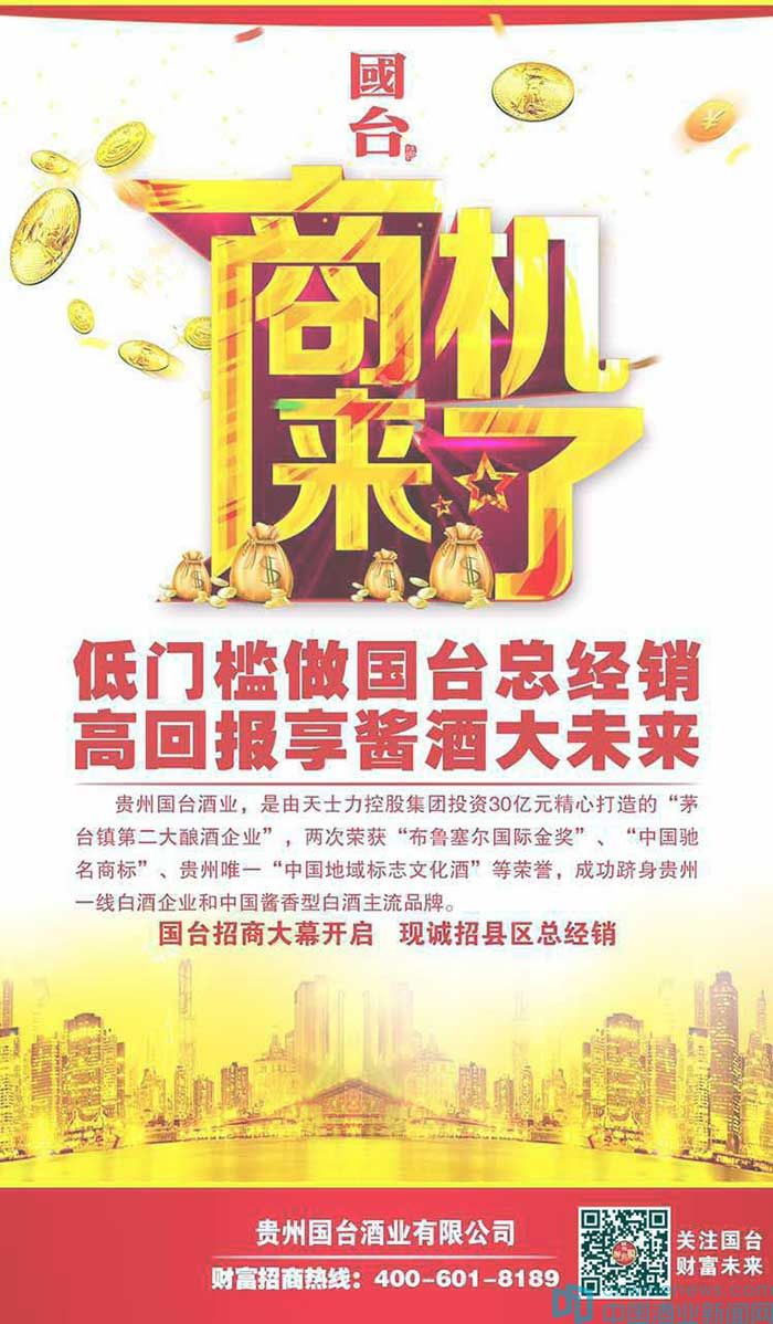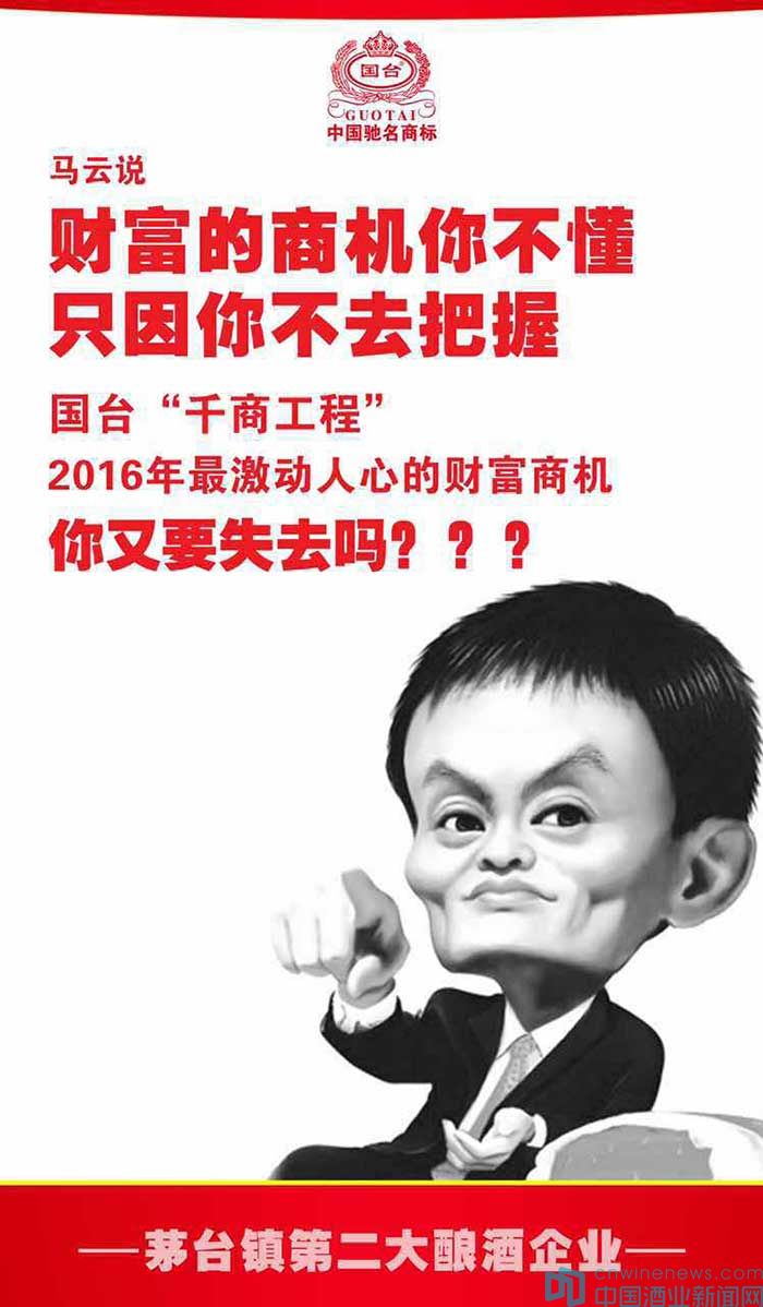 同时,在这个互联网+时代,“旧时王谢堂前燕 飞入寻常百姓家”的平常与普及,令机会再一次呈现均等分布的趋势:一个更有“宜室宜家”气质,有“贵州国台酒酱香新领袖”品牌地位的正宗大曲酱香型白酒国台的出现,令众多渠道商感到了“柳暗花明又一村”的豁然开朗,正在进行中的“千商工程”无疑将成为众多终端渠道商进入酱酒市场的绝好良机。从厂家到终端渠道商再到消费者,这个与时俱进的酒企,这个多次被誉为独树一帜的酒企,打破了传统的层层代理局面,缩短了一瓶酒到终端用户的距离;独创酱酒的价值体系,缩短和普通用户的距离;而其独创的异地酒窖工程,则被誉为“行业首创”,令“存钱不如存酒”的概念深入人心。
