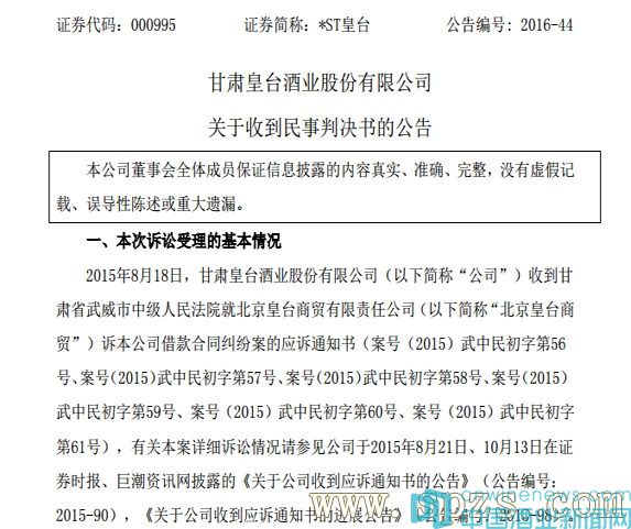 但是,三次借款期满后,皇台酒业未能按时归还贷款。2015年8月,北京皇台商贸向甘肃省武威市中级人民法院提起诉讼,数日后皇台酒业收到相关借款合同纠纷案的应诉通知书。