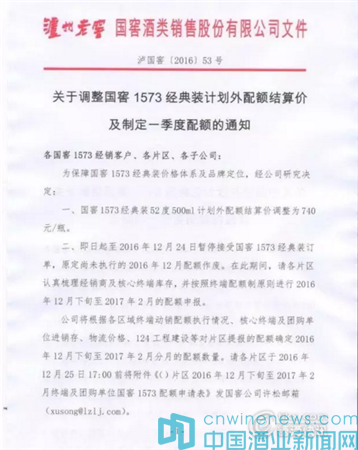 昨日,泸州老窖国窖酒类销售公司下发关于调整国窖1573经典装计划外配额结算价及制定一季度配额的通知。通知中指出,为保障国窖1573经典装价格体系及品牌定位,经公司研究决定: