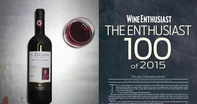 美国《葡萄酒爱好者(Wine Enthusiast)》杂志评选出2015年度 “The Enthusiast 100”好酒榜,意大利San Felice酒庄的Chianti Classico 2011 Il Grigio Gran Selezione拔得头筹。包括这款酒在内,共有18款意大利葡萄酒榜上有名,名列第二,第一是美国,有30款葡萄酒上榜,(可以看出,美国杂志对于美国酒通常都是比较偏爱的)。