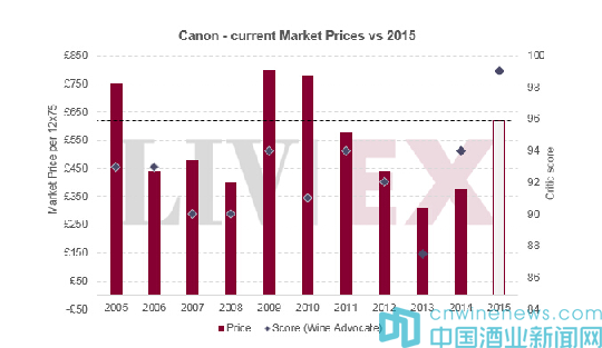 相比卡农酒2014年份,虽然2015年份的价格显着上涨,但它的得分也同样飞升。尼尔·马丁Neal Martin(98-100)称它为“该历史性酒庄的典范”,而James Suckling更给它100满分,称其为 “该酒庄有史以来最出色的红葡萄酒。”