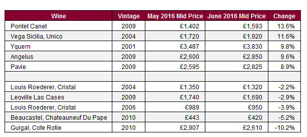 本月2009年份的波尔多葡萄酒表现不错,100满分(RP)的庞特卡奈Pontet Canet和帕斯Pavie、以及99+分(RP)的金钟Angelus均有所涨价。然而,在排行镑的另一端,雄狮Leoville Las Cases 2009年却呈现跌价。两个年份的水晶Cristals香槟在6月份也出现跌价,但最大的输家还是吉佳乐世家Guigal“La Las”2010年。综括来说,6月份的Liv-ex优质葡萄酒100指数表现积极,该指数中有85%葡萄酒的价格均呈现稳定或上升。