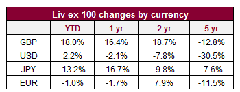 欧元、日元和美元的买家已充份利用这有利的货币汇率。如下图表所示,今年以来,以日元计算的优质葡萄酒100指数跌幅最大。