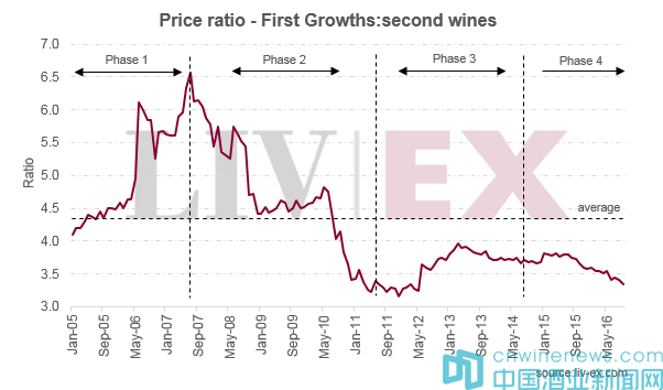 上图显示了自2005年起,一级酒庄的主牌葡萄酒与其副牌葡萄酒之间的价格关系;而这关系已经历了多个阶段。第一阶段是直至2007年夏天,市场一向是由“传统的”英国和欧洲优质葡萄酒买家主导。一级酒庄的价格正不断上涨,但品牌效应不但没有令其副牌酒受惠,反而加大了它们之间的价格差距。