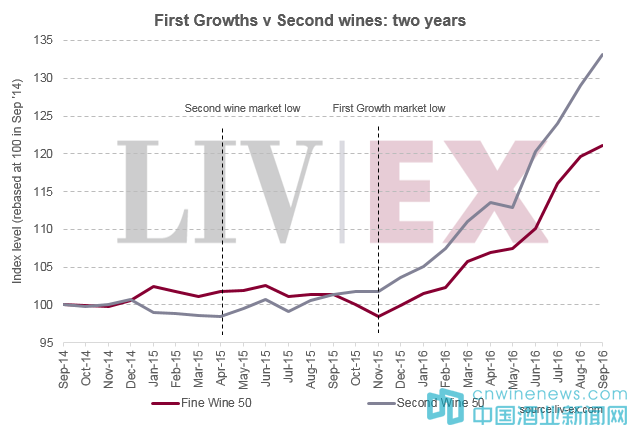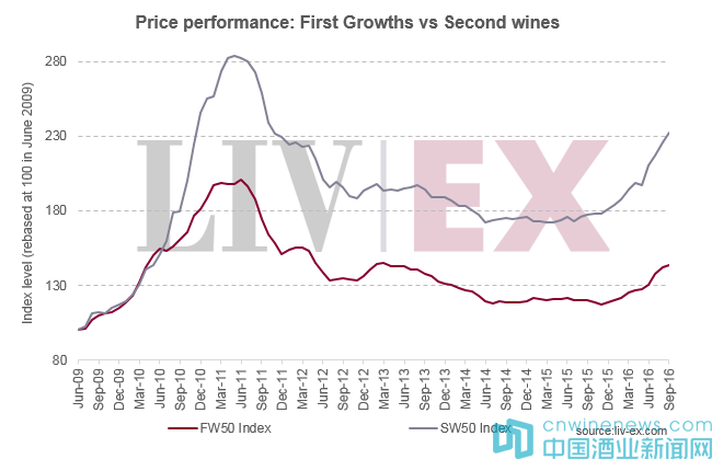 此时,品牌导向的中国买家开始进一步推高波尔多葡萄酒的价格,尤其是一级酒庄和其副牌葡萄酒。由于拉菲Lafite Rothschild及其它一级酒庄的价格已高至令人目眩的水平,使副牌葡萄酒因其低得多的品牌入门价位而更具吸引力。如下图所示,至2010年中期,副牌葡萄酒的价格暴涨。在2009年6月至2011年6月期间,跟踪一级酒庄葡萄酒价格走势的Liv-ex优质葡萄酒50指数上升了101%;而副牌葡萄酒50指数则更上升了183%。至2011年12月,一级酒庄主牌葡萄酒的平均价格只比副牌葡萄酒高3.2倍。