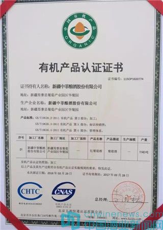 近日,新疆中菲酿酒股份有限公司,获得由北京五洲恒通认证有限公司颁发的“有机产品认证证书”(证书编号:115OP1600774)。
