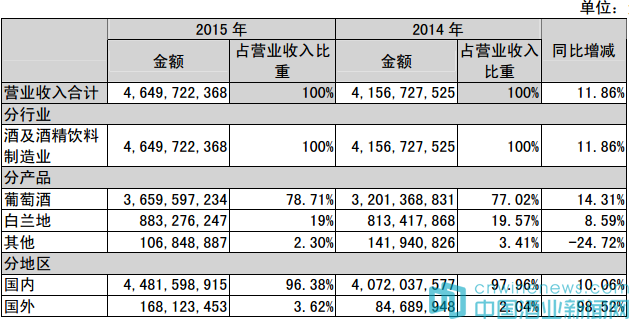 年报显示,2015年,张裕营收达到46.50亿元,同比增长11.86%;归属于上市公司股东的净利润10.30亿元,同比增长5.36%。