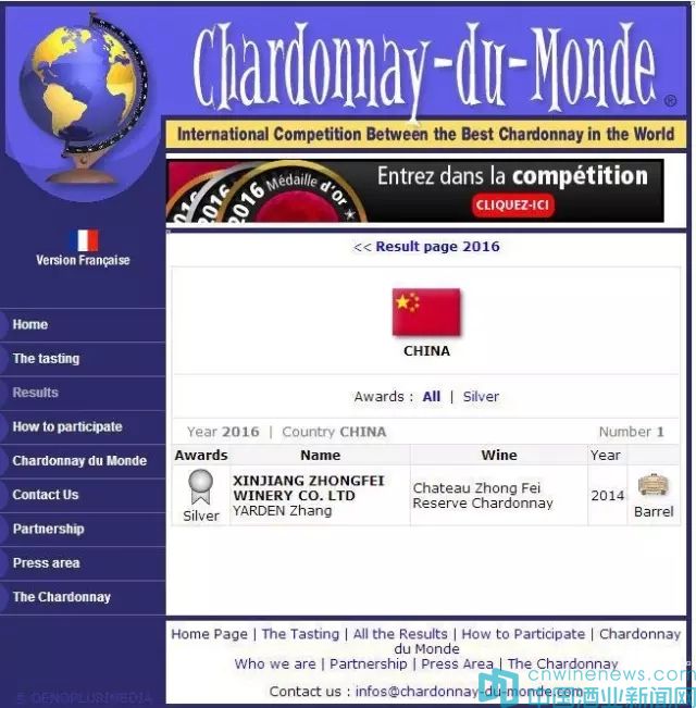 中菲酒庄2014霞多丽干白葡萄酒成为本次大赛唯一获奖中国葡萄酒