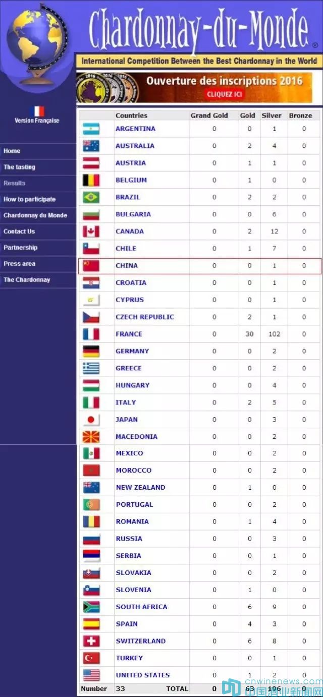 据悉,本次大赛共有全球782款霞多丽葡萄酒参赛;其中,获得奖项的共有33个国家,包括63个金奖、196个银奖。