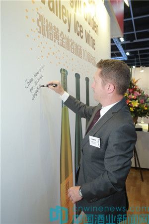 Vinexpo展会的CEO纪尧姆先生出现在张裕黄金冰谷冰酒上市10周年庆活动现场,他说:“张裕黄金冰谷冰酒喝起来水果味迷人,有天然的酸度,口感清爽、细腻,完美、平衡,比加拿大冰酒更好。”他欣然为张裕黄金冰谷冰酒10周年庆题词:“世界冰酒新锐产区——中国,祝贺张裕!“