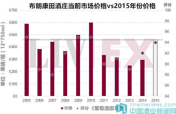 此次布朗康田酒庄的2015年期酒发布价为460英镑/箱(12*750毫升)(折合人民币约4,338元),比2014年份首次公布的310英镑(折合人民币约2,923元)相比上涨了48.4%。