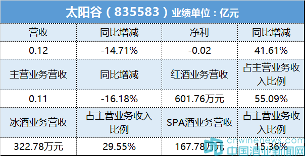8月24日,太阳谷(835583)发布半年度报告。半年报显示,太阳谷上半年实现营收1153.24万元,同比下降14.71%;净利-212.63万元,同比增长41.61%;主营业务实现营收1092.32万元,同比下滑16.18%。其中在主营业务营收方面,红酒业务上半年实现营收601.76万元,占55.09%;冰酒业务上半年实现营收322.78万元,占29.55%;SPA酒业务上半年实现营收167.78万元,占15.36%。