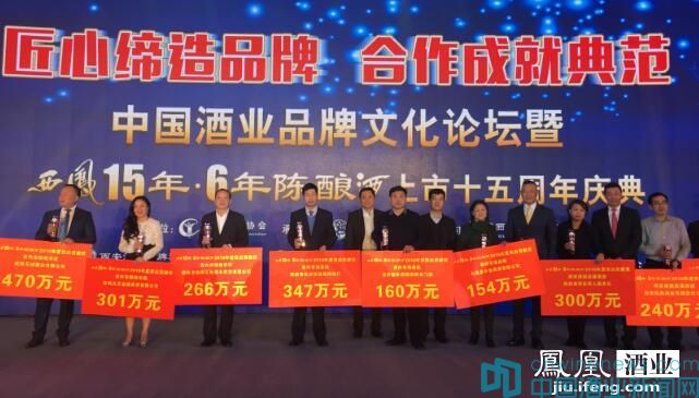 2016年,45度、52度西凤15年6年陈酿酒总销量为1224万瓶,实现总销售额15.65亿元。实现了百亿西凤梦的跨越式迈进,更实现了陕西白酒业的至尊荣耀。对整个陕西白酒行业而言,更是一次提振士气的鼓舞。大会上,颁发了2016年突出贡献奖。咸阳天诚酒业有限公司、宝鸡义方金樽商贸有限公司、榆林市榆阳区新秦丰商贸有限公司,西安市长安区泓福祥商行、大荔县平安商贸有限公司,志丹县华晨烟酒副食门市,陕西省军区军人服务社、西安泓昌酒业有限责任公司、西安华鼎商贸有限公司分别获得地市级、县级、西安区域前三名,庆阳陇裕三和品牌营销有限公司获得省外市场县级突出贡献奖。省内外突出贡献奖累计合计为2452万元。